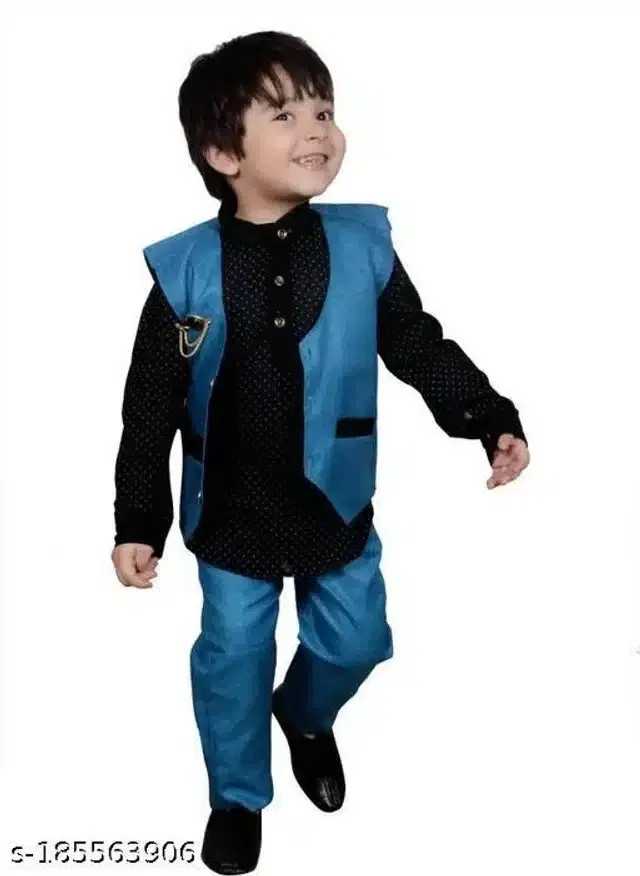 Name: Kids Boys 3Piece Kurta,Jacket with pant set Top Fabric: Cotton Blend Bottom Fabric: Cotton Blend Sleeve Length: Long Sleeves Top Pattern: Self Design Bottom Pattern: Self Design Net Quantity (N): Single Add-Ons: Jacket Sizes: 6-7 Years (Bottom Length Size: 28 in) 7-8 Years (Bottom Length Size: 30 in) 8-9 Years (Bottom Length Size: 30 in) 9-10 Years (Bottom Length Size: 32 in) 10-11 Years (Bottom Length Size: 35 in) 11-12 Years (Bottom Length Size: 35 in) 12-13 Years (Bottom Length Size: 37 in) 13-14 Years (Bottom Length Size: 37 in)