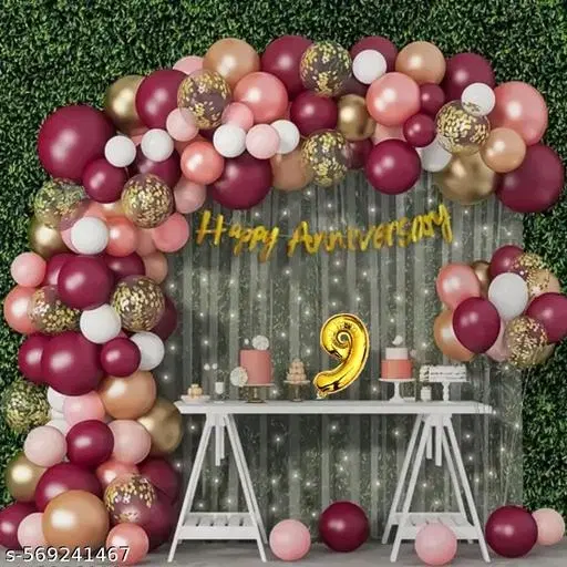 IN THIS COMBO YOU'LL RECEIVE 10 PCS BURGUNDY BALLOONS, 10 PCS WHITE BALLOON, 10 PCS PESTLE PINK BALLOONS, 10 PCS GOLDEN BALLOON, 5 PCS GOLDEN CONFETTI BALLOON, 1 PCS GOLDEN HAPPY ANNIVERSARY BUNTING, 1 PCS RICE LED LIGHT, 1 PCS WHITE NET CURTAIN.