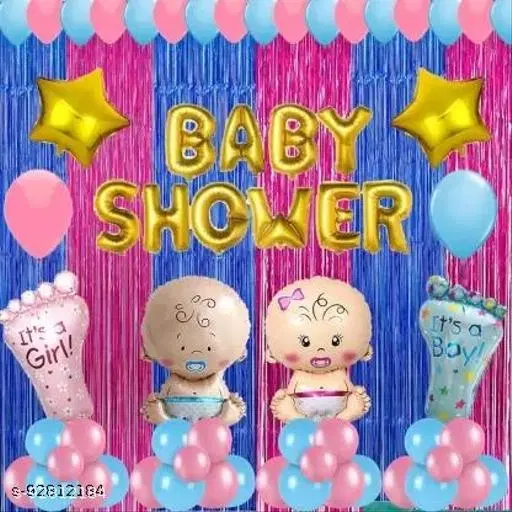 Baby Shower Decoration at home includes - A set of Baby Shower foil balloon which can be stuck on the wall or the curtain with the help of string available in the kit, Stick blue and pink shimmer on the wall, Blow the balloons with the help of air pump and stick it around the foil balloon. Blow the Baby foils, Footprint foils & Star foils and stick it around the backdrop.