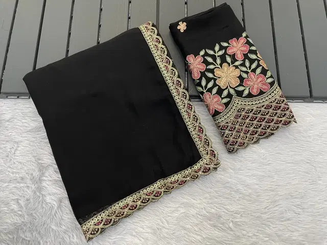 Women's Black Rangoli blooming with Handwork-sequence and floral cut work border blouse