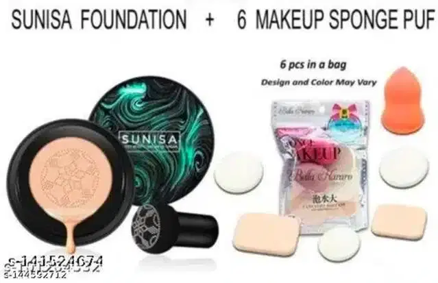 Name: COMBO OF SUNISA FOUNDATION WITH MUSHROOM LONG PUFF PACK(MATTE FINISH) WATER BEAUTY AND AIR CC CREAM FOUNDATION +MAKEUP PUFFS AND BLENDER(PACK OF 6)