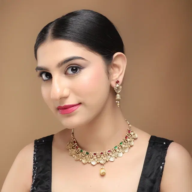 Copper Kempu Stone Choker Necklace with Earrings for Women, Set of 1 (Multicolor)