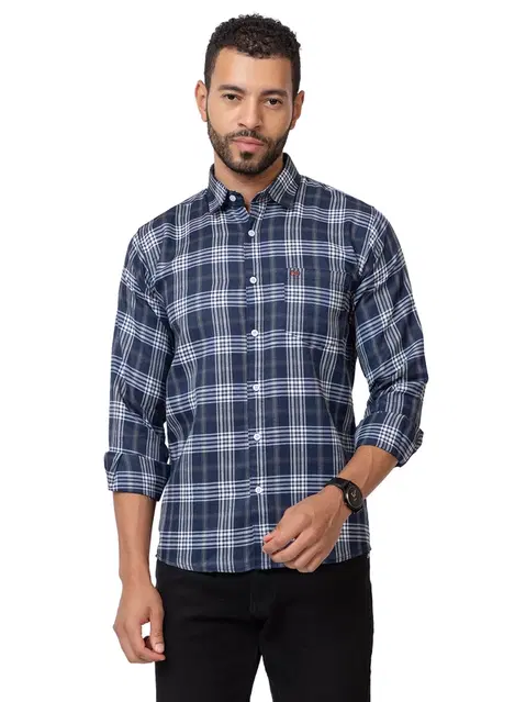 Cotton Blend Checkered Shirt for Men, Navy Blue (M)