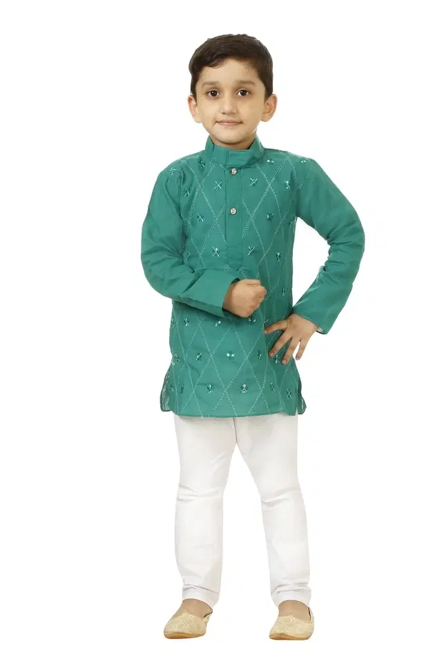 Cotton Blend Embroidery Kurta with Payjama for Boys, Teal & White (8-9 Years) - Buy Online at CityMall