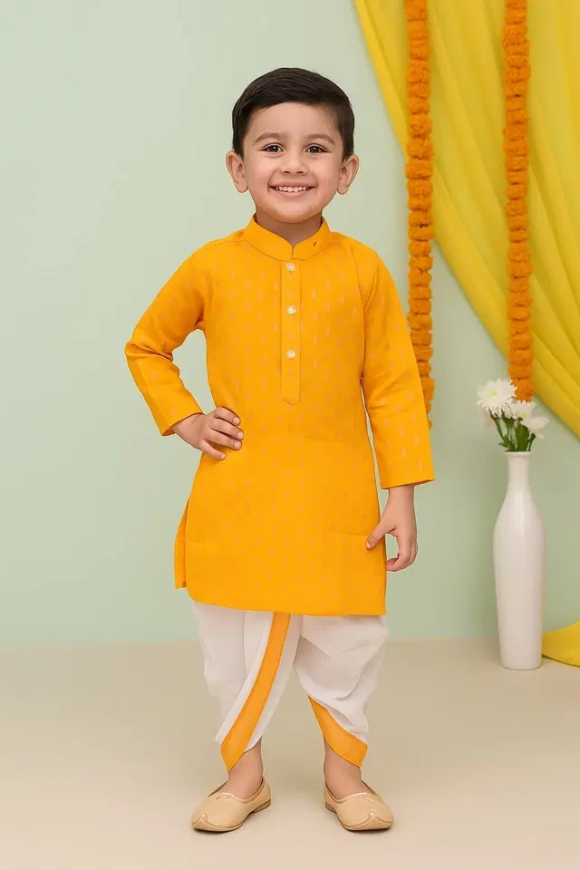 Make your little one look festive-ready in this stylish yellow kurta and white dhoti pant set for boys. The bright yellow kurta comes with a classic mandarin collar and button placket, made with soft and breathable fabric for all-day comfort. Paired with a white cotton dhoti pant with yellow border, this outfit is perfect for festivals, weddings, cultural events, or family functions. The outfit is both traditional and trendy, designed to keep your child comfortable while looking adorable.