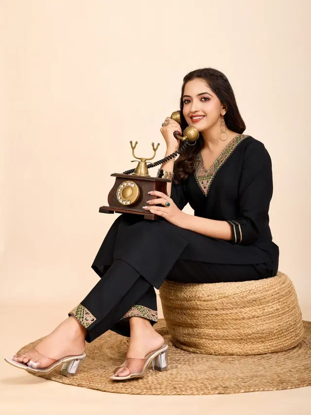 Cotton Blend Self Design Kurta with Pant for Women (Black, L) - Buy Online at CityMall
