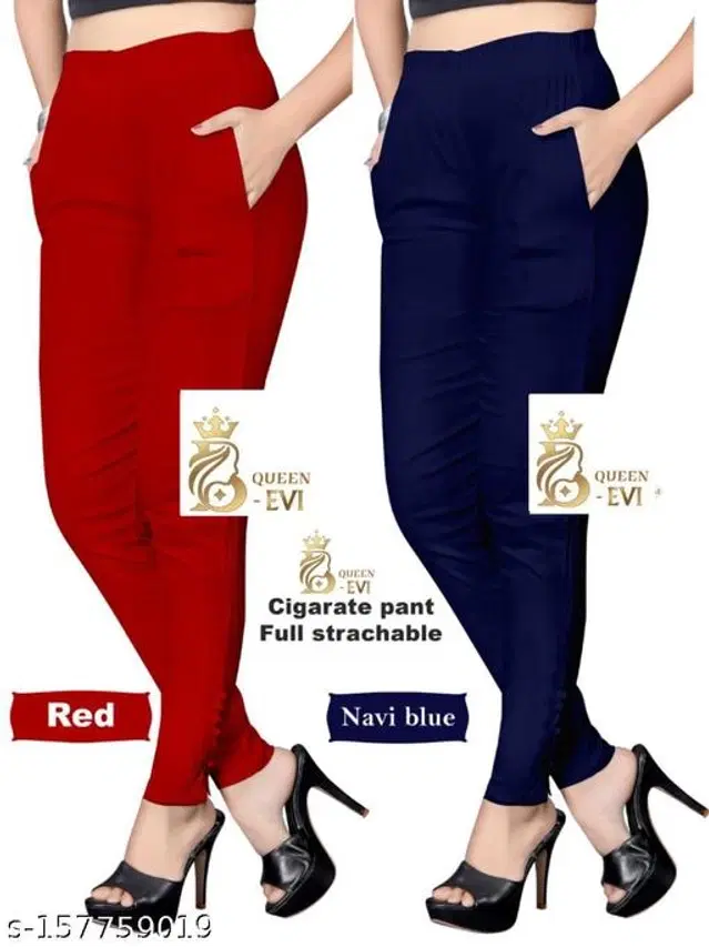 Cotton Lycra Straight Fit Trouser for Women, Pack of 2 (Red & Navy Blue, 48)