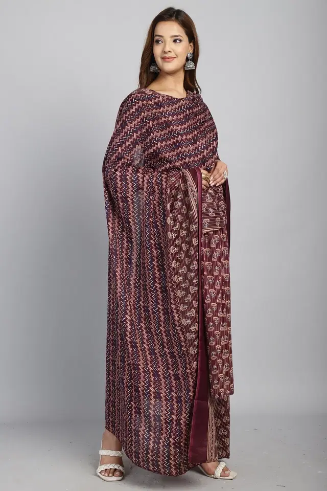 A-Line Cotton Printed Kurti with Bottom & Dupatta Set for Women (Maroon, S) - Buy Online at CityMall