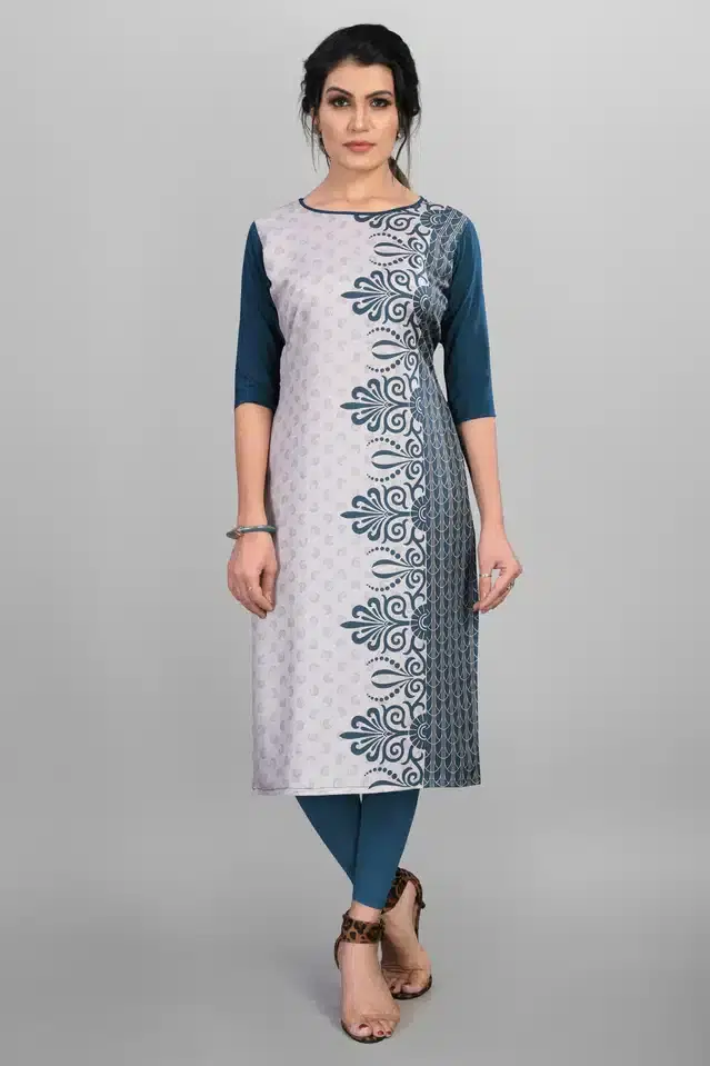 Material: American Crepe Occasion: Casual & Festive Sleeves: 3/4 Sleeve Style: Straight Kurti Length (Shoulder to Bottom hem) 44 inches Front Side Print (Back Side Plain) Straight Kurta Packet contains: 1 readymade Kurta. Bust Sizes: Small (36), Medium (38), Large (40), X-Large (42), and XX-Large (44) {in inches} Care: Wash Separate with good detergent Note: Product color could be different due to Desktop or Mobile Brightness