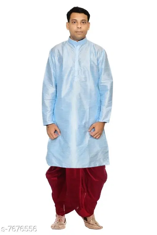 Dupion Silk Solid Kurta with Dhoti for Men (Sky Blue & Maroon, XXXL)