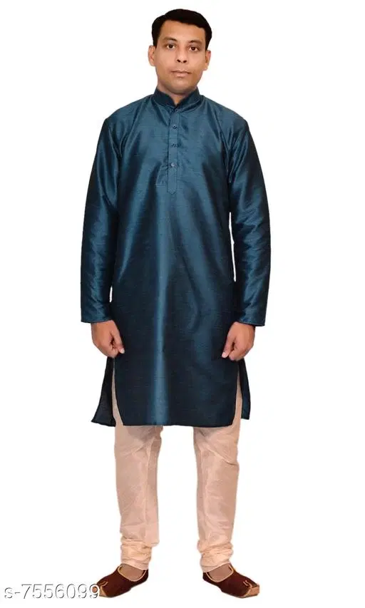 Dupion Silk Solid Kurta with Pyjama for Men (Teal & Cream, XL)
