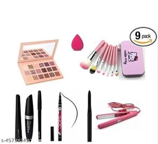 Name: High quality makeup combo nude eyeshadow+ mascara+eyeliner+kajal+straightener and brudhes