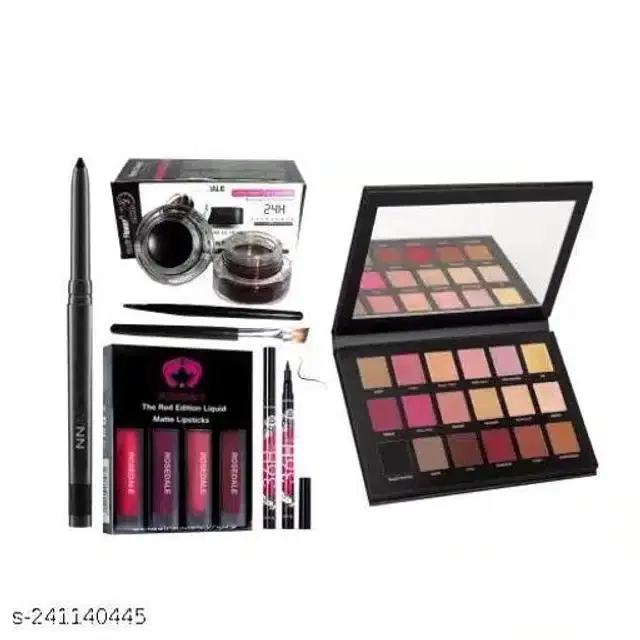 Name: Kajal+4in1 liquid lipsticks red edition + 36h black waterproof eyeliner + rosegold pigmented Eye Shadow palette + music flower 2in1 black and brown eye brow colors combo of 5
