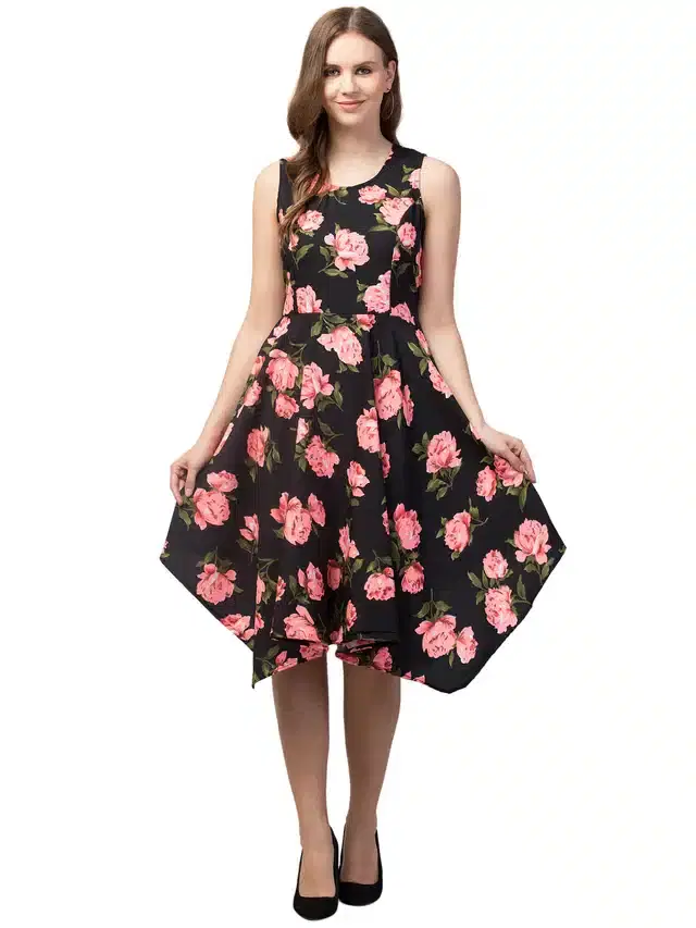 Floral Printed Asymmetric Dress for Women (Black, XXL)