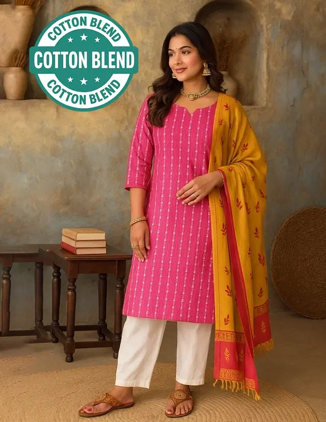 Define your festive charm with flair. This elegant pink kurti is crafted from premium cotton fabric, offering a blend of comfort and style. It is featuring a graceful striped design, styled with 3/4 sleeves. Perfect for festive gatherings, casual outings, or everyday elegance. Pair it with your favorite accessories and elevate your ethnic style effortlessly.