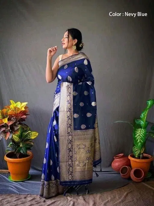 Litchi Silk Botanical Saree for Women, Navy Blue (6.3 m) - Buy Online at CityMall