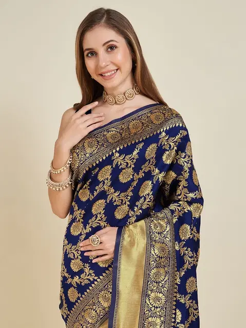 Litchi Silk Floral Saree for Women, Navy Blue (6.3 m) - Buy Online at CityMall