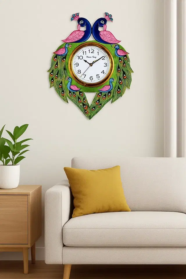 The Khatu Crafts Peacock Design Analog Wall Clock (25x25 cm) features a vibrant peacock design with a durable plastic frame. Its colorful and artistic look adds a unique touch to any room while providing reliable timekeeping.