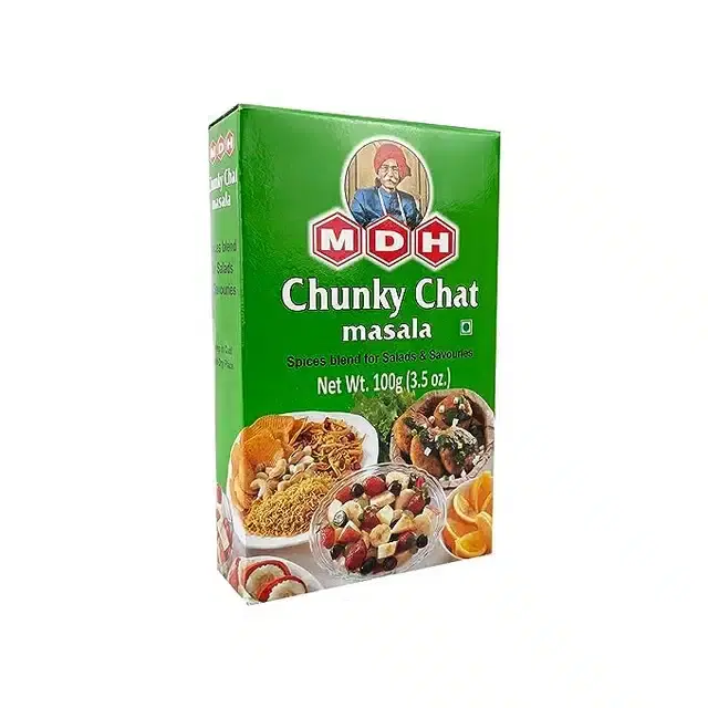 Product Description MDH Chunky Chat Masala is spice mix for salads. Chat Masala is a necessary seasoning in Indian cuisine. This alluring tart, spicy, peppery and salty mix of spices is used to improve the flavor of all from fruits to flavorful snacks. It is a blend of salt, black salt, cumin, dry mango powder, pomegranate seeds, coriander, black pepper, nutmeg, mint leaves and extra spices.
