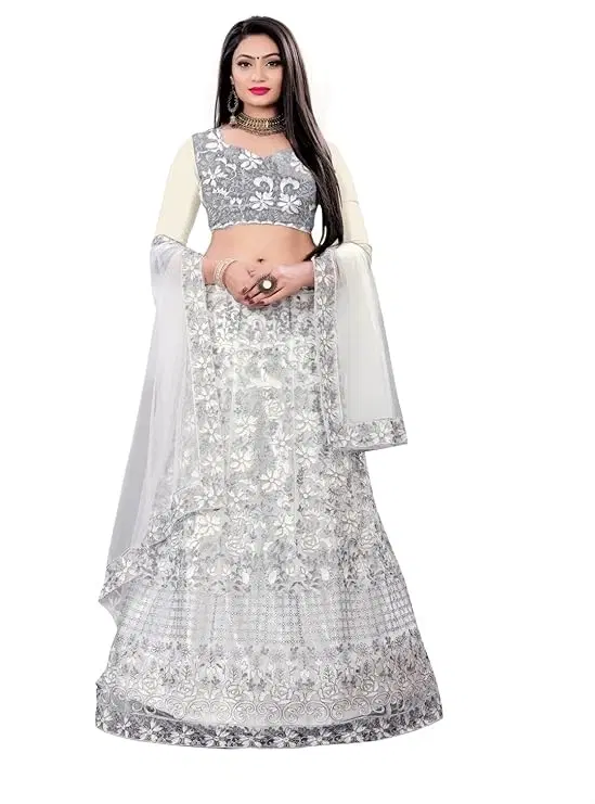 Net Printed Semi-Stitched Lehenga Choli with Dupatta for Women (Grey & White, Free Size)