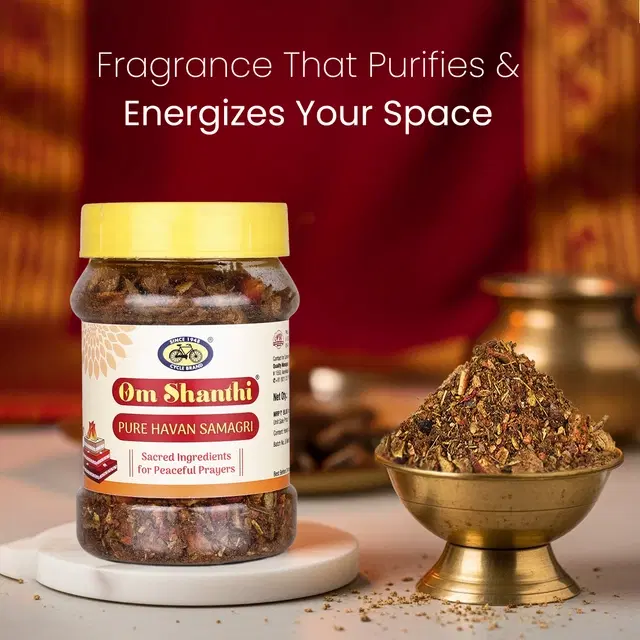 Om Shanthi Pure Havan Samagri (120g) from House of Cycle is a premium blend of natural ingredients, ideal for enhancing spiritual rituals. Used for havans and pujas, it creates a peaceful and sacred atmosphere with a soothing fragrance. Perfect for those seeking purity and quality in their spiritual practices.