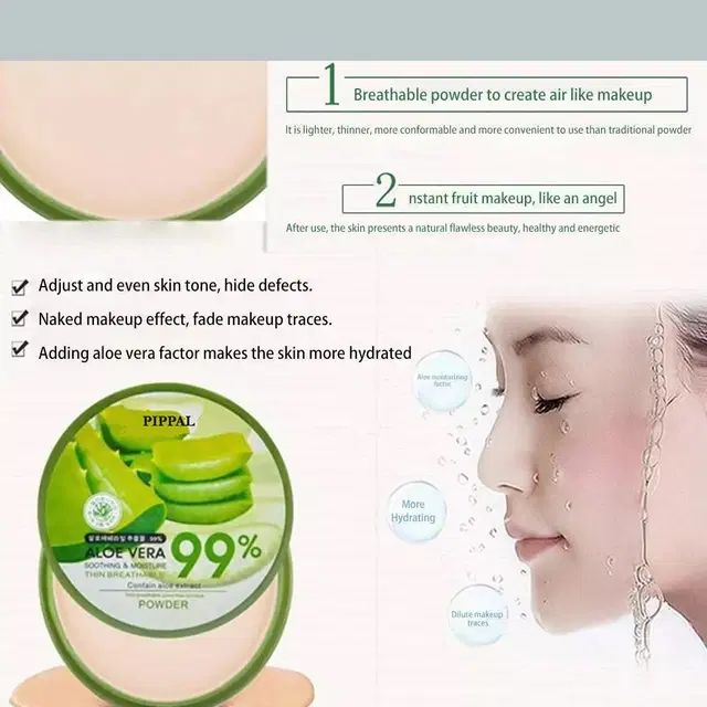 Pippal Aloe Vera Contain Aloe Extract 99% Soothing Moisture Powder Compact 20g. skin smooth breathing, does not clog pores. Added Dioxide tecture and germproof funtion, use it anytime it has soft and smooth powder that quit fit with skin but not heavy; skin of apply layer after layer. Fine Powder:- Silty fine powder, thinner than the average, soft and delicatetexture, hidden facial pores defects. Ingredients:- Talc, Mica, Mineral Oil, Magnesium Myristate, Kaolin, Parfum. Caution: - Storage in cool and dry place, keep away from children for normal skin only, stop using when skin allergic reaction occurs.Product color may slightly vary due to photographic lighting sources or your monitor settings. For external use only. Patch test is Advisable. Net Weight:-20gm