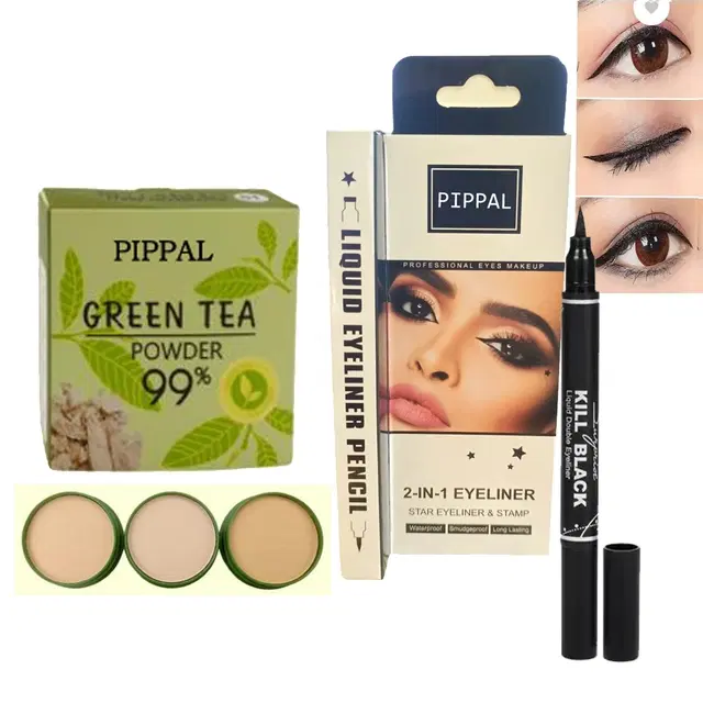 Pippal Green Tea Powder 99% Compact Natural Fress Face Powder 20g (Pack of 1) With 2 In 1 Star & Stamp Waterproof Supar Black Eyeliner
