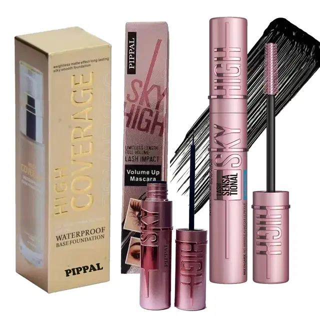 Pippal High Coverrage Waterproof Base Foundation Silk Touch Create The Makeup 60ml Pack of 1 With Sky High Volume Up Mascara & Waterproof Supaer Black Eyeliner
