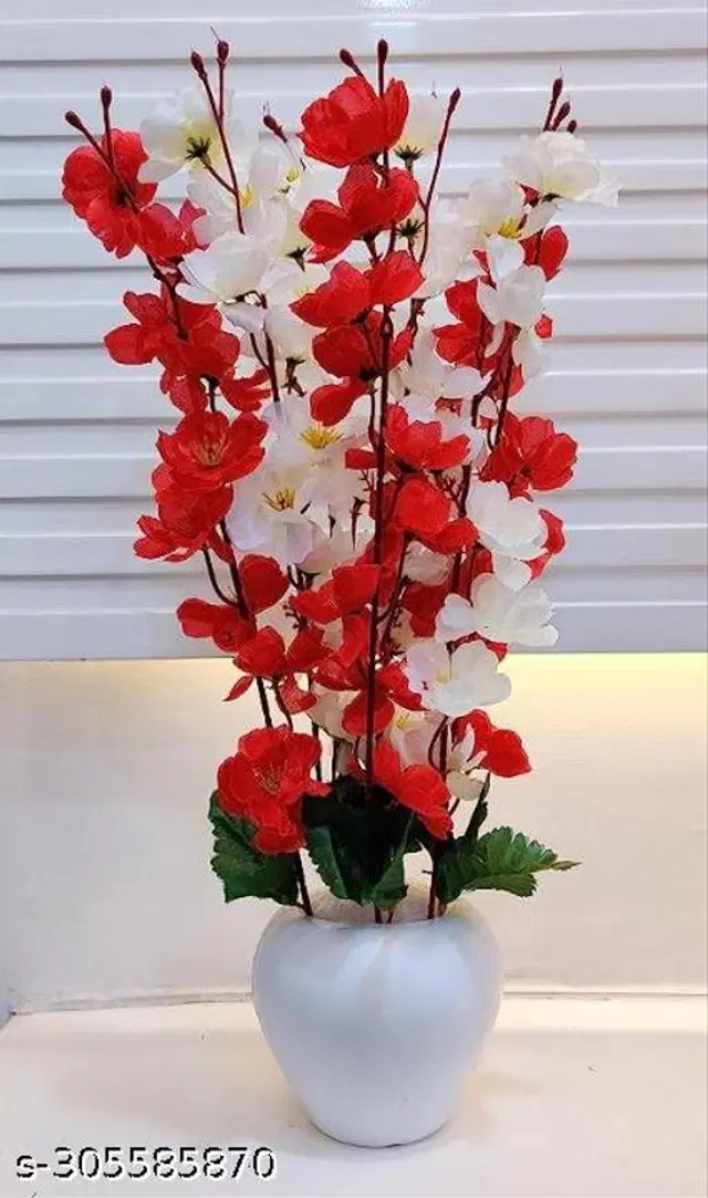 Artificial Flowers for Decoration with Pot, Home Decor, Office Decor, Cherry Blossom Combo, White Red, 1Piece