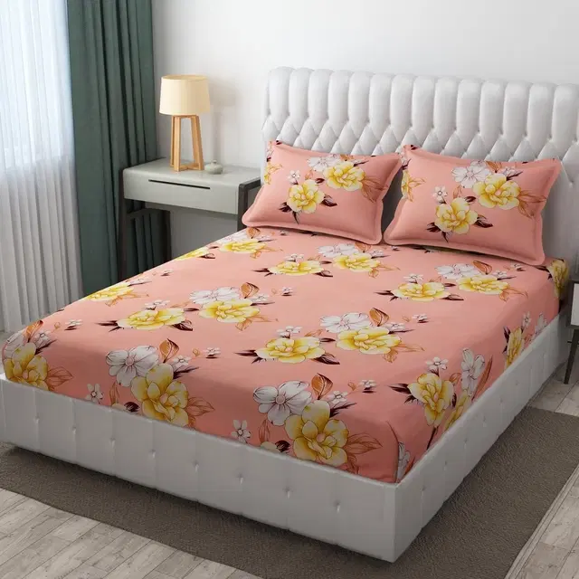 Polycotton Printed Double Size Bedsheet with 2 Pillow Covers, Pink, 90x100 inches