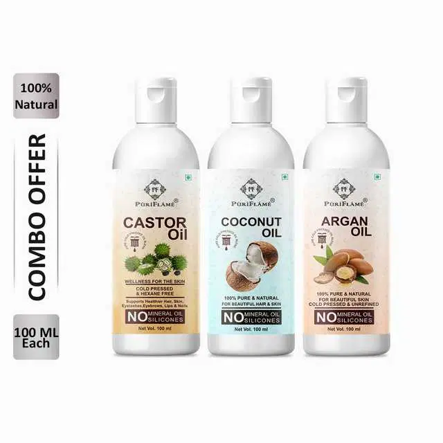 PuriFlame Pure Castor Oil, 100 ml & Coconut Oil, 100 ml & Argan Oil, 100 ml Combo For Rapid Hair Growth, Pack Of 3, B-3386 @ ₹390 - Buy Online at CityMall