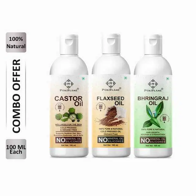 PuriFlame Pure Castor Oil, 100 ml & Flaxseed Oil, 100 ml & Bhringraj Oil, 100 ml Combo For Rapid Hair Growth, Pack Of 3, B-3406 @ ₹371 - Buy Online at CityMall