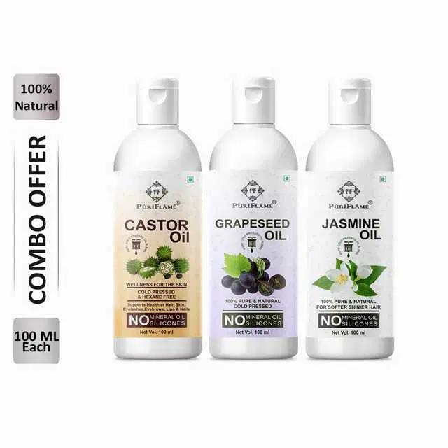 PuriFlame Pure Castor Oil, 100 ml & Grapeseed Oil, 100 ml & Jasmine Oil, 100 ml Combo For Rapid Hair Growth, Pack Of 3, B-3428 @ ₹390 - Buy Online at CityMall
