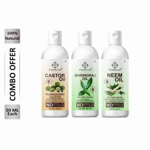 Puriflame Pure Castor Oil, 50 ml, Bhringraj Oil, 50 ml & Neem Oil, 50 ml Combo for Rapid Hair Growth, Pack of 3, B-9879 @ ₹276 - Buy Online at CityMall