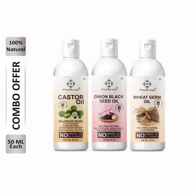 Puriflame Pure Castor Oil, 50 ml, Onion Black Seed Oil, 50 ml & Wheat Germ Oil, 50 ml Combo for Rapid Hair Growth, Pack Of 3, B-10056 @ ₹295 - Buy Online at CityMall