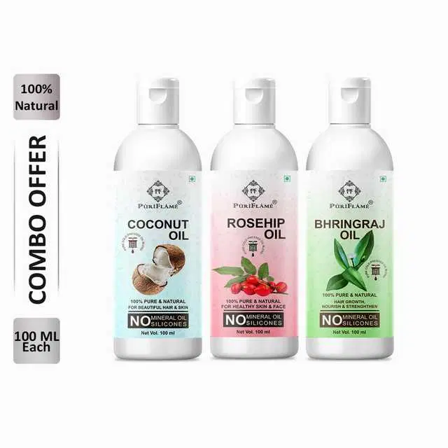 PuriFlame Pure Coconut Oil, 100 ml & Rosehip Oil, 100 ml & Bhringraj Oil, 100 ml Combo For Rapid Hair Growth, Pack Of 3, B-3910 @ ₹390 - Buy Online at CityMall