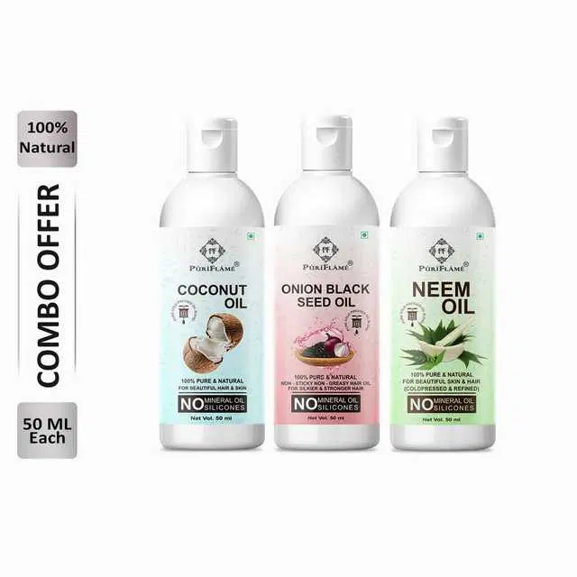 Puriflame Pure Coconut Oil, 50 ml, Onion Black Seed Oil, 50 ml & Neem Oil, 50 ml Combo for Rapid Hair Growth, Pack Of 3, B-10356 @ ₹276 - Buy Online at CityMall