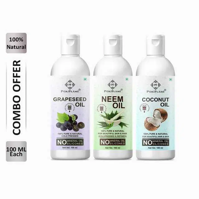 PuriFlame Pure Grapeseed Oil, 100 ml & Neem Oil, 100 ml & Coconut Oil, 100 ml Combo For Rapid Hair Growth, Pack Of 3, B-4525 @ ₹381 - Buy Online at CityMall