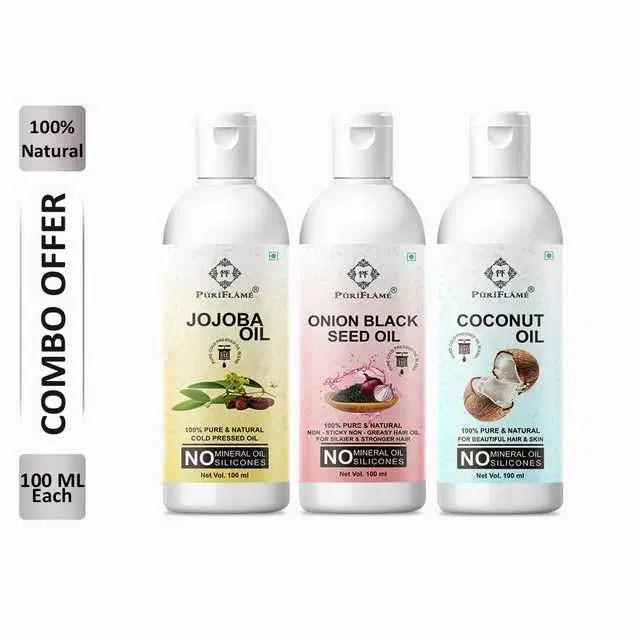 PuriFlame Pure Jojoba Oil, 100 ml & Onionblackseed Oil, 100 ml & Coconut Oil, 100 ml Combo For Rapid Hair Growth, Pack Of 3, B-5244 @ ₹362 - Buy Online at CityMall