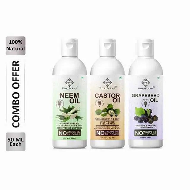 Puriflame Pure Neem Oil, 50 ml, Castor Oil, 50 ml & Grapeseed Oil, 50 ml Combo for Rapid Hair Growth, Pack Of 3, B-12052 @ ₹286 - Buy Online at CityMall