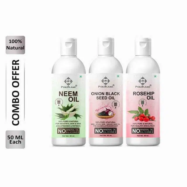 Puriflame Pure Neem Oil, 50 ml, Onion Black Seed Oil, 50 ml & Rosehip Oil, 50 ml Combo for Rapid Hair Growth, Pack Of 3, B-12195 @ ₹295 - Buy Online at CityMall