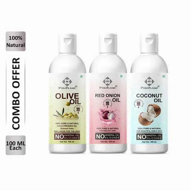 PuriFlame Pure Olive Oil, 100 ml & Red Onion Oil, 100 ml & Coconut Oil, 100 ml Combo For Rapid Hair Growth, Pack Of 3, B-6288 @ ₹352 - Buy Online at CityMall