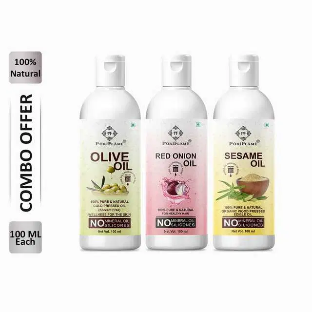 PuriFlame Pure Olive Oil, 100 ml & Red Onion Oil, 100 ml & Sesame Oil, 100 ml Combo For Rapid Hair Growth, Pack Of 3, B-6297 @ ₹362 - Buy Online at CityMall
