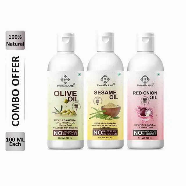 PuriFlame Pure Olive Oil, 100 ml & Sesame Oil, 100 ml & Red Onion Oil, 100 ml Combo For Rapid Hair Growth, Pack Of 3, B-6332 @ ₹352 - Buy Online at CityMall