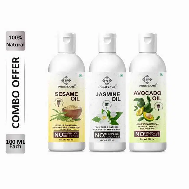 PuriFlame Pure Sesame Oil, 100 ml & Jasmine Oil, 100 ml & Avocado Oil, 100 ml Combo For Rapid Hair Growth, Pack Of 3, B-7562 @ ₹362 - Buy Online at CityMall