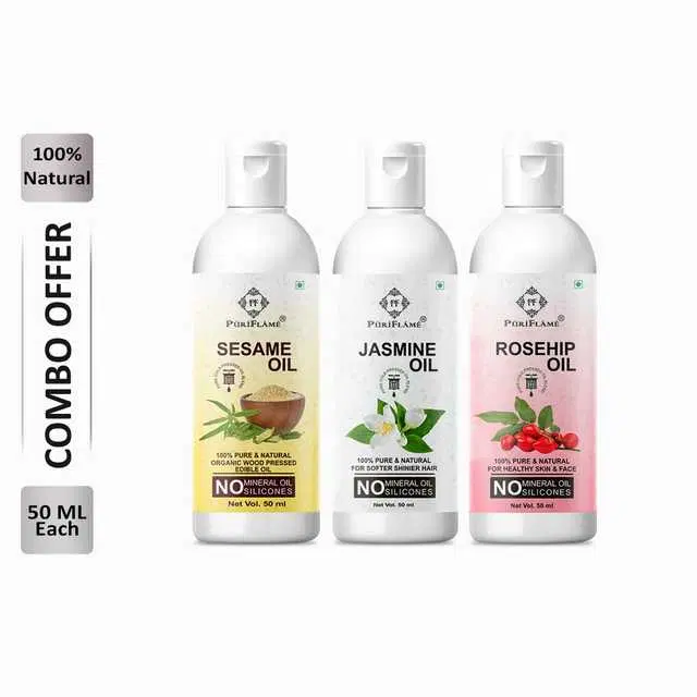Puriflame Pure Sesame Oil, 50 ml, Jasmine Oil, 50 ml & Rosehip Oil, 50 ml Combo for Rapid Hair Growth, Pack Of 3, B-13658 @ ₹257 - Buy Online at CityMall