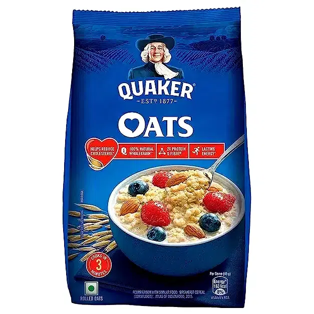 Product Description Start the day right with a bowl of nutritious Quaker Oats! These 100% Natural Wholegrain Oats have complex carbohydrates that break down slowly, providing lasting energy. Along with an active lifestyle consuming 2 bowls of oats per day provides 3g of soluble fiber and Beta-glucan; this helps reduce cholesterol as part of a diet low in saturated fat and sodium. They are also a rich source of fiber and protein. Quaker Oats can either be eaten sweet or savory. Enjoy the wholesome benefits of this whole grain in various meals or snacks at any time of the day. For a hearty breakfast meal, add milk topped with fruits and nuts; for a warming sweet flavor, add honey, cinnamon, or brown sugar. You can also add them as a wholesome ingredient in your favorite dishes, such as Idli, Poha, Masala Oats, or Classic Oatmeal cookies.