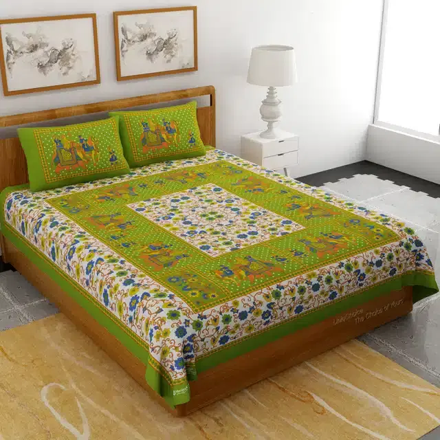 Rajasthani Traditional Cotton Bedsheet With 2 Pillow Covers, Green, 492 X 94 Inch, Mc-407