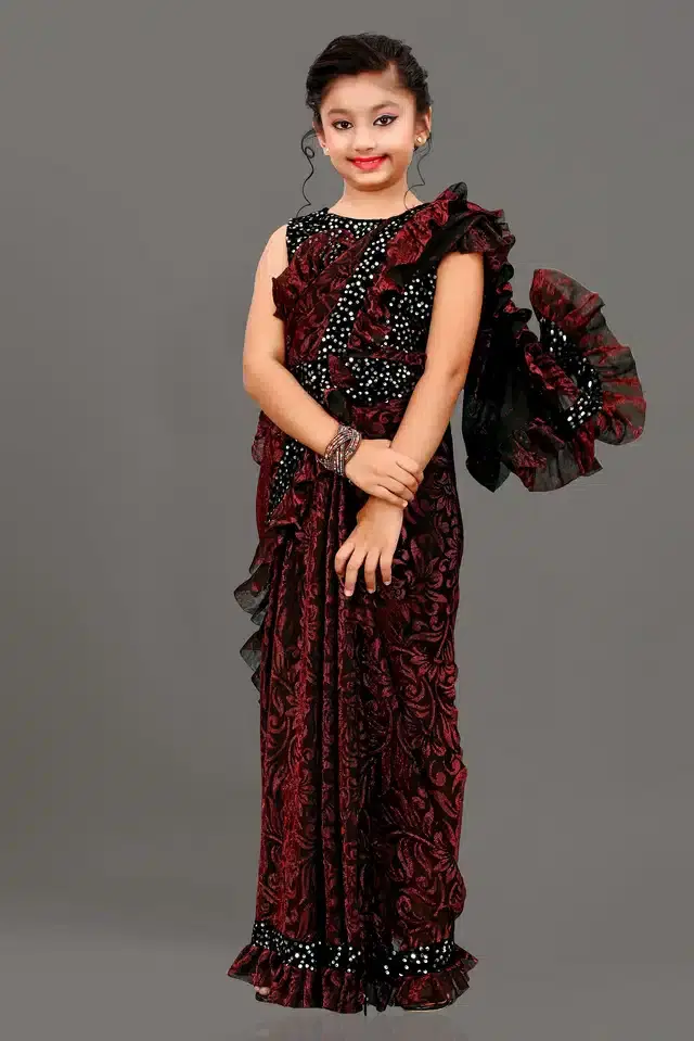 Saree Fabric: Silk Blouse Fabric: Velvet Blouse: Separate Blouse Piece Pattern: Lace Blouse Pattern: Sequence Net Quantity (N): 1 Navy Blue Colored Lycra Blend Ruffle Saree Is Specially Designed For The Most Gorgeous Baby Girls. This Fully Embellished Saree Is Made Out From The Soft Lycra Material That Is Stitched & Light In Weight, Which Will Give Your Baby A Comfy Feel, It Is Soft & Easy To Handle And Highly Breathable That'Ll Keep Your Baby Joyful, Relaxing, And Comfortable. This Self Design Solid Saree Is Decorated With Ruffle New Unique Style & Sequins Lace Border With Sequins Patch Work That Will Give Your Saree A Perfect Look While Maintaining Its Elegance. Saree Comes With an Unstitched Velvet Blouse Piece That Is Full Cover With Sequins Work. Comfortable To Drape Throughout The Day, This Good Looking Saree Is Perfect To Wear During The Formal Hours. You, Will, Find Many Party Options From Our Kids’ Ethnic Collection Including Sequined, Shimmery, And Other Embellished Versions. Sizes: 3-4 Years, 4-5 Years, 6-7 Years, 8-9 Years, 10-11 Years Country of Origin: India