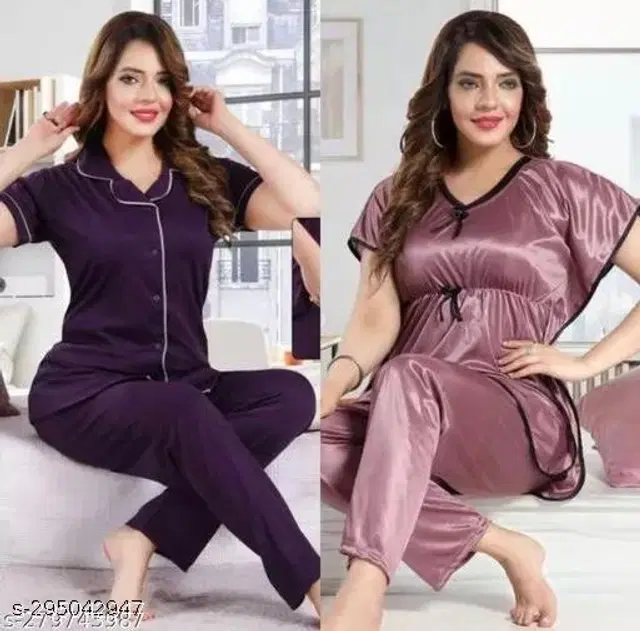 Satin Nightsuit for Women, Pack of 2 (Purple & Wine, XXL) - Buy Online at CityMall